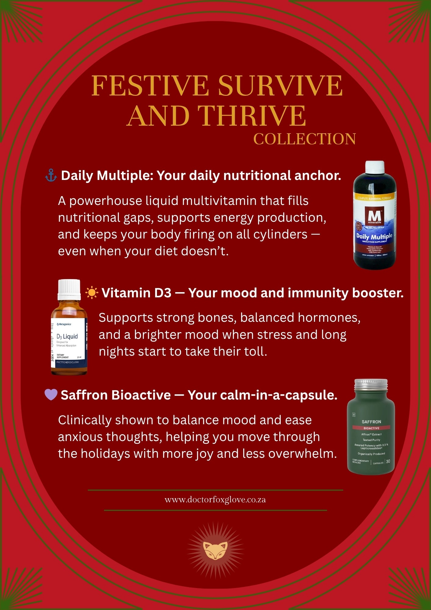 The Festive Survive and Thrive Collection is your go-to for keeping mind, mood, and body in balance during the busiest time of year. Itโs all about steady energy, calm focus, and strong immunity โ so you donโt just survive the season, you actually thrive.